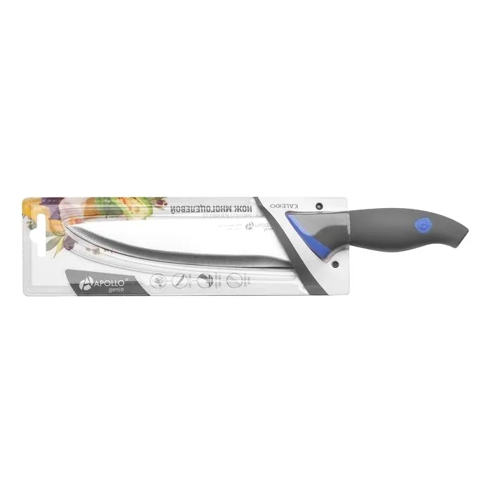 Нож Kaleido изготовлен из высококачественной нержавеющей стали 3Cr14SS, благодаря этому лезвие ножа долго сохраняет острую заточку. Рукоятка ножа выполнена в эргономичной форме из специального пищевого пластика, который приятен на ощупь и не позволяет ножу выскользнуть из руки. Не рекомендуется мыть в посудомоечной машине. Длина лезвия – 9 см. Толщина лезвия – 1 мм