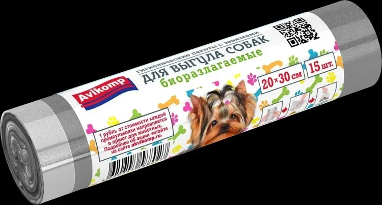 "AVIKOMP" Мешки биоразлагаемые для выгула собак с завязками ПНД, 20х30см,15шт