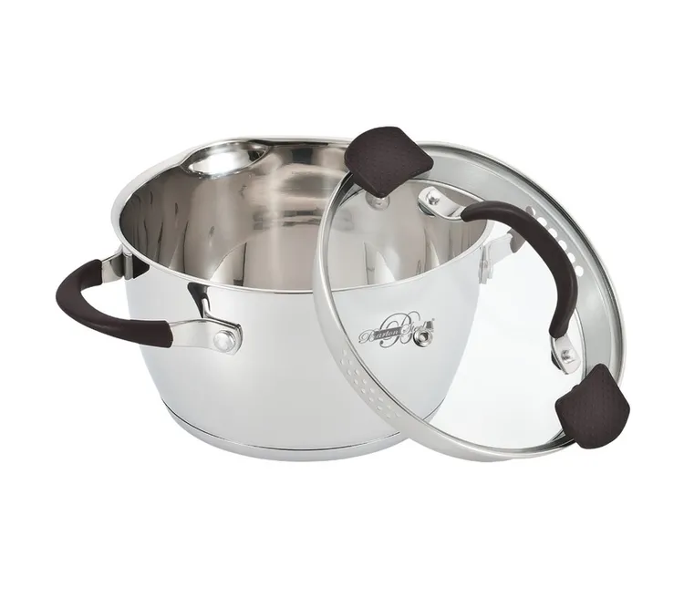 Материал: Кастрюля из высококачественной нержавеющей стали со стеклянной крышкой. Размер 24х13,5см. Объем 5,5л. Кастрюля конической формы с глубокими краями. Крышка с отверстиями для выпуска пара и слива жидкости. На крышке два пластиковых фиксатора для удобства слива.