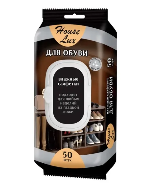 Влажные салфетки House Lux разработаны специально для придания вашей обуви безупречного вида. Компоненты, входящие в состав пропитывающего лосьона, эффективно удаляют пыль и загрязнения, обеспечивают блеск и длительную защиту от влаги и загрязнений.Подходят так же для других изделий из кожи и заменителей кожи (сумок, перчаток и пр.) упаковка - 50 шт.