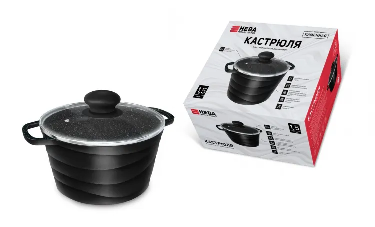 "Каменная" Черный гранит" Кастрюля со стекл. крышкой 1,5л