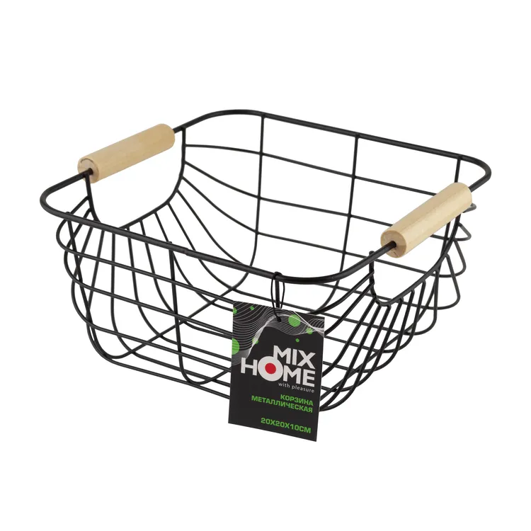 Корзина металлическая с деревянными ручками 20х20х10см, цв.черный