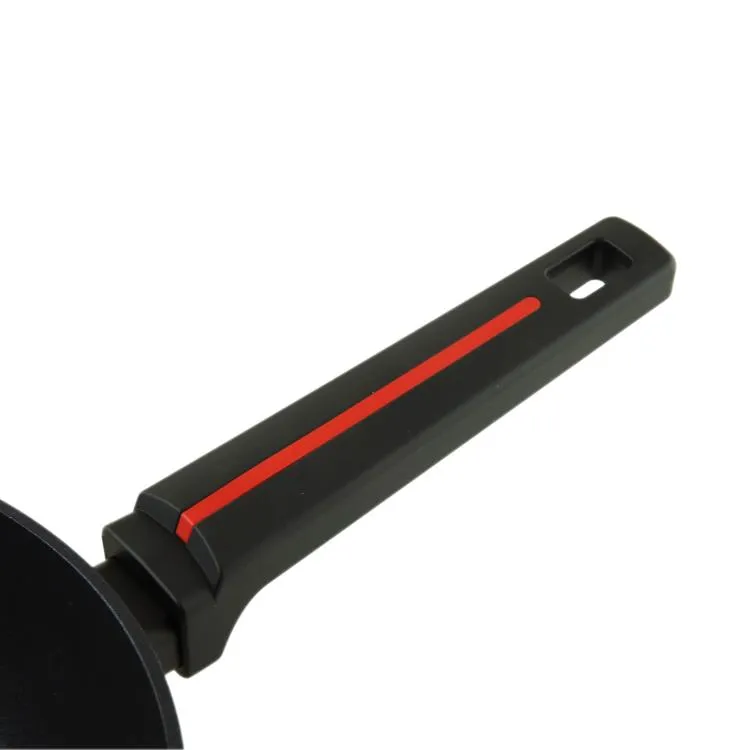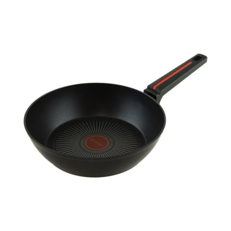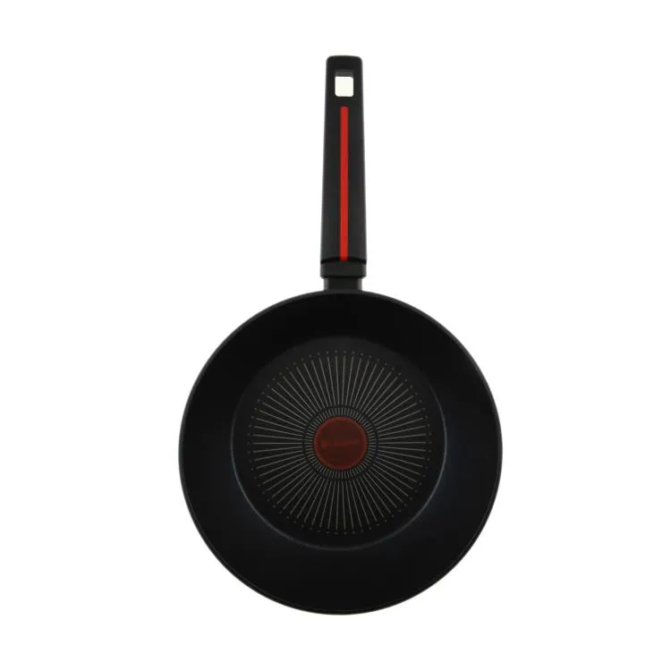 Откройте для себя комфорт и мастерство приготовления с глубокой сковородой! Изготовленная с применением современных технологий и имеющая литой алюминиевый корпус, сковорода гарантирует превосходный результат при жарке и тушении. С технологией равномерного нагрева ваша пища будет приготовлена одинаково хорошо по всей поверхности, что делает её идеальной для различных блюд. Экологичное многослойное покрытие делает этот сотейник антипригарным и устойчивым к повреждениям. Ручка из ударопрочного пластика с антискользящим покрытием Soft Touch обеспечивает комфорт и уверенность во время использования, а возможность подвеса добавит удобства в хранении. Простота ухода – ещё одно преимущество: сковорода без проблем может быть вымыта в посудомоечной машине. указывает на достижение оптимальной температуры для жарки.