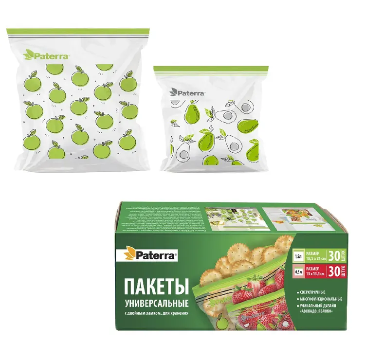 "PATERRA" Набор пакетов "Авокадо, яблоко" универсал. с 2замками 60шт. 15,5х15см; 18,5х21см