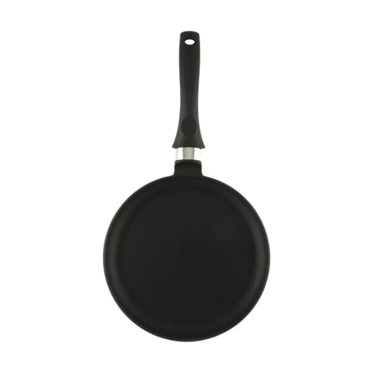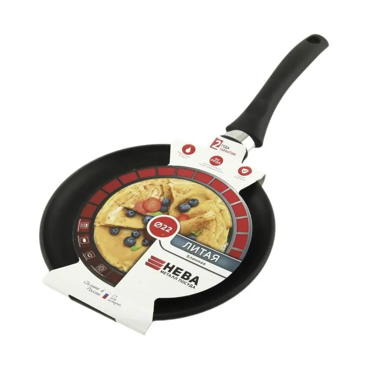 Сковорода имеет низкий борт и удобную ручку, благодаря чему легко переворачивать и снимать блины. Утолщенное дно обеспечивает особые термоаккумулирующие свойства: блин равномерно пропекается по всей толщине и красиво румянится с обеих сторон. Благодаря антипригарному покрытию они всегда легко снимаются со сковороды и не пригорают, даже при выпекании без использования масла.