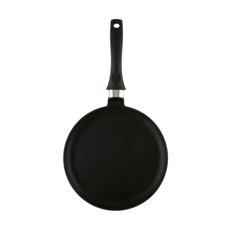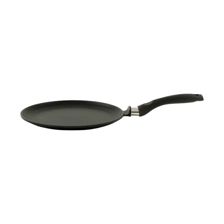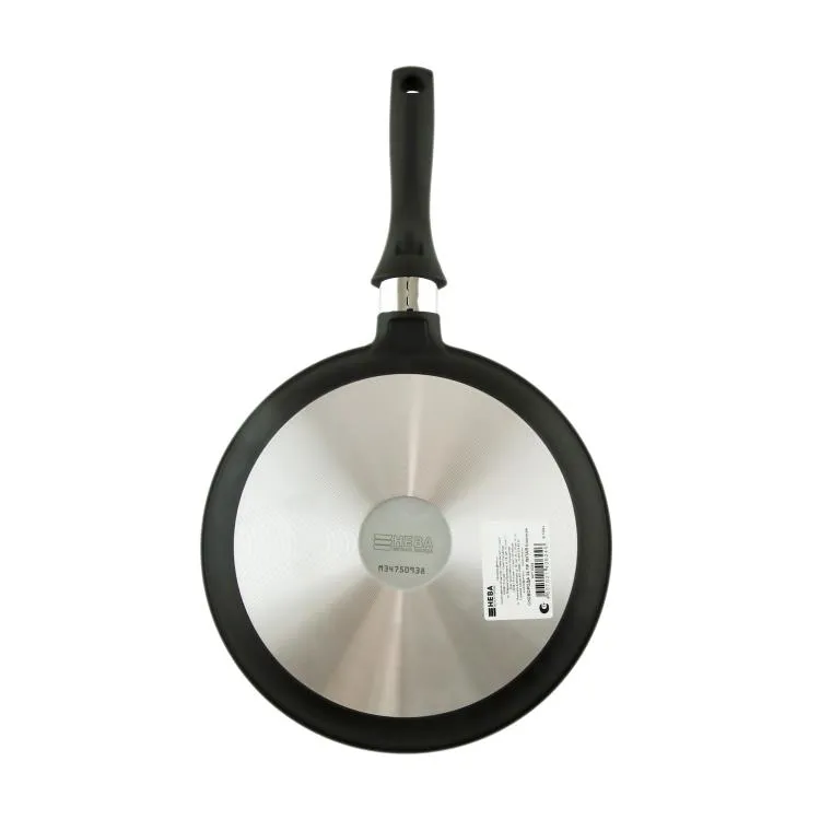 Блинная сковорода имеет низкий борт и удобную ручку, благодаря чему легко переворачивать и снимать блины даже без использования масла. Утолщенное дно обеспечивает особые термоаккумулирующие свойства: блин равномерно пропекается по всей толщине и красиво румянится с обеих сторон.